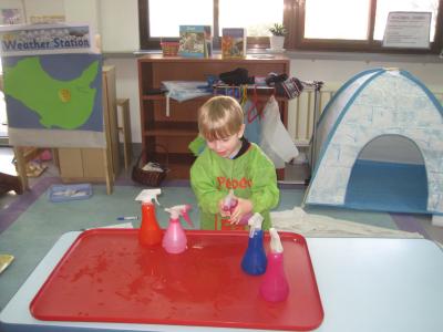 Sobald Nils hört, dass mit Wasser geplantscht wird, ist er sofort zur Stelle und schon werden die Gummistiefel geholt.