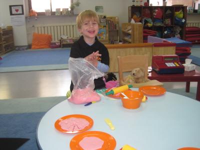 Über den Puzzlegarten und das Leseeck arbeiteten wir uns zur Matheecke vor, wo Nils fleißig Knetpizza "kochte" und an die anwesenden Teddys und Puppen (=Gäste) aufteilte.