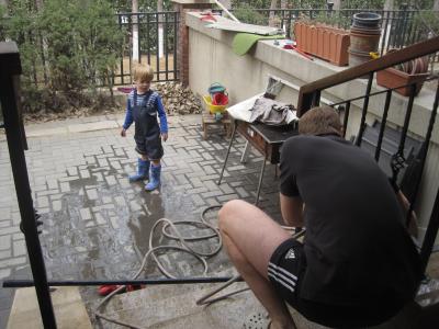 Papa und Nils haben den Hof völlig unter Wasser gesetzt, alle Spielzeuge gesäubert und Nils hat sogar noch das Geländer geputzt... und Spaß gemacht hat es wohl auch noch!