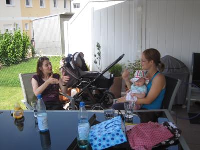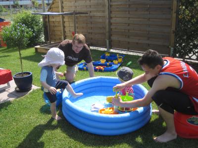 Als es uns zu heiß wurde ging es zu den Webers in den Garten und dort konnten die Mütter ausgiebig Neuigkeiten austauschen, die Kinder plantschen und die Papas die Spielsachen ausprobieren.
