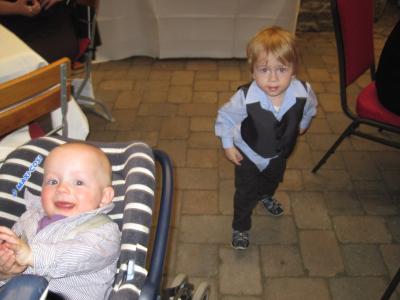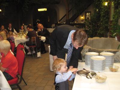 So, jetzt geht es endlich los: Nils zog sich seinen "guten" Anzug an ( den uns Tante Emmi (=Steffi) besorgt hatte) und zog zu Großmamas Party los. Besonders stolz war er auf sein Hemd, weil Papa das ja auch trägt. Nils erklärte dann auch erst mal, dass er "arbi" (= arbeiten gehen) würde.