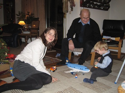 Nils fand den Christbaum toll und erst die Geschenke: Auto in Massen, einen Zug und dann auch noch DAS BLAUE FLUGZEUG. Nils verliebte sich im ersten Moment !!! Zweitrangig blieb, dass dieses Teil in einen Reisekoffer nach China passen musste (Schluck!).
