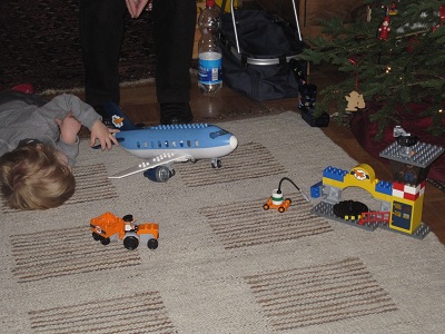 Zwischendurch konnte er noch kurz Großmama beim Auspacken helfen, aber dann musste der Flughafen mit Flugzeug in Betrieb genommen werden.