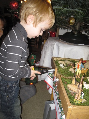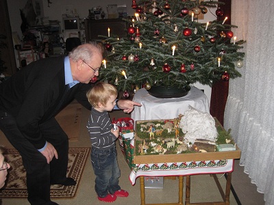 Erst wurde mit Opa die Krippe begutachtet. Opa baut die in jedem Jahr liebevoll auf, Nils hat sie dann etwas "umgebaut".