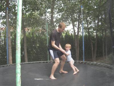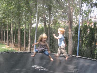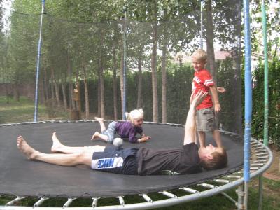 Wie schon berichtet ist das große Trampolin im Compund eingezogen. Seitdem vergeht kein Tag, an dem wir nicht die Schuhe von uns werfen und Nils zum "hüppo" abzischt.