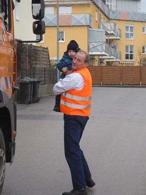 Offensichtlich hat mein Kind das Müllauto bei seinem morgendlichen Spaziergang mit Opa so lange verfolgt, dass die netten Müllmänner auf den kleinen Zwerg im Schneeanzug aufmerksam wurden.