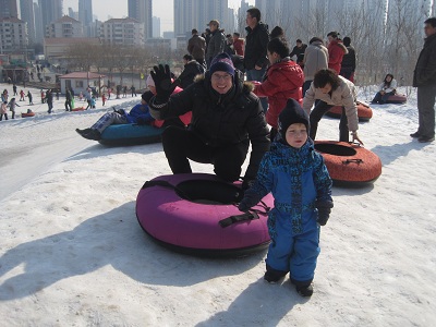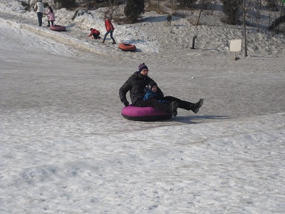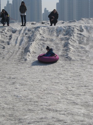 Schnee war in diesem Jahr Fehlanzeige (nur einmal hat es die Regierung schneien lassen - das ist KEIN Witz ! ), aber zum Glück hat ein findiger Geschäftsmann eine kleine Rodel- und Skibahn in einem benachbarten Park aufgebaut.