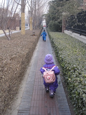 ... und versucht hinterher zu kommen, wenn Nils zum Kindergarten losspurtet.